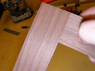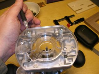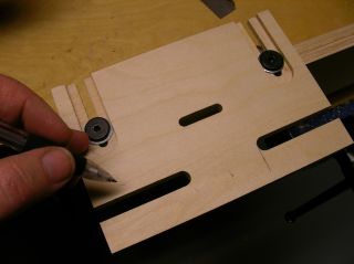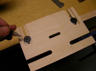 I routed a relief in the bottom of the template, hoping the dust could escape. That didn't help. So I enlarged the slot and used a larger bushing. Still no good. Looking at the bottom of the router, I decided my next attack would be to remove two of the screws for the plastic sub-base, and use longer screws with plastic spacers to create guides that would ride in 3/8" wide slots in a new template. Well, this worked even better than expected. With the bushing out of the picture, dust was properly evacuated from the mortise. And the 3/8" spacers I found at my local hardware store fit in a 3/8" wide slot cut by a router bit PERFECTLY. The router moves like it is on rails. The width of the mortise (1-1/8") is controlled by the center (non-wasted) part of the slot. As the 3/8" spacers I've attached to the bottom of the router reach the end of their slots, they stop the router from moving any further. For smaller workpieces, I prefer to use my template on a larger fence I clamp in my workbench vise. But I've also made a smaller fence that allows me to clamp the template directly to a larger workpiece (a table stretcher, for example). The edge-to-mortise distance is controlled by two screws (the black ones) that you see on top of the jig. I used knock-down furniture screws because they have large yet thin heads. They thread into cross-dowels in the fences. I purchased all the hardware at my local Ace Hardware. I was surprised when I assembled the first joint and saw just how nicely it fit together. There was just enough side-to-side play to align edges nicely during glue-ups, and yet the faces of the first and subsequent test pieces have been perfectly flush. I normally impress myself, but not THIS much. This design should be adaptable to many different types of routers. Anything that has holes for mounting a sub-base. I especially like the DW611, as it is nice and compact and easy to maneuver.